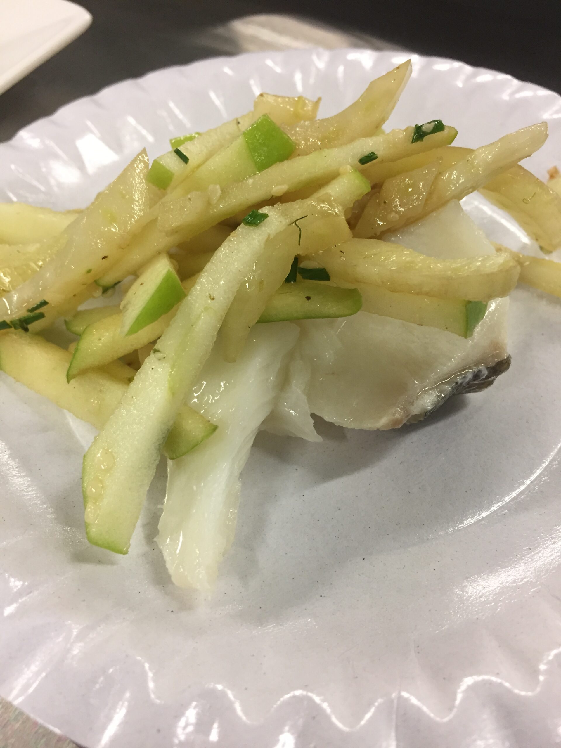 - Snij de appel in fijne reepjes en meng alles onder de venkel.
