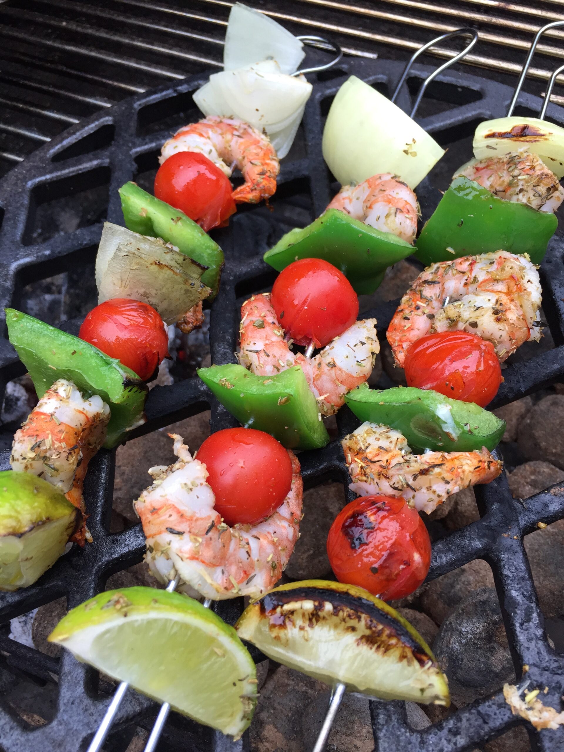 - Maak een spiesje met de ui, scampi, trostomaat, paprika, repeat 🙂 en werk af met een partje limoen.